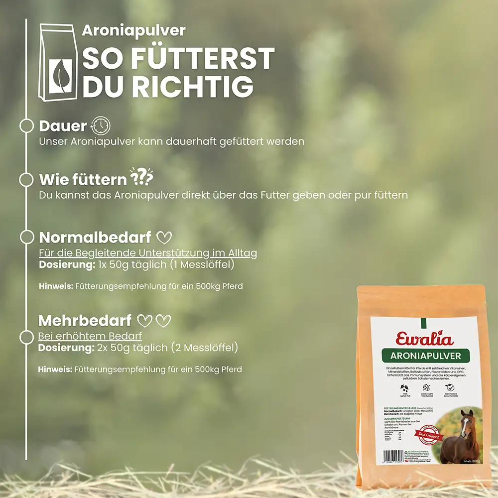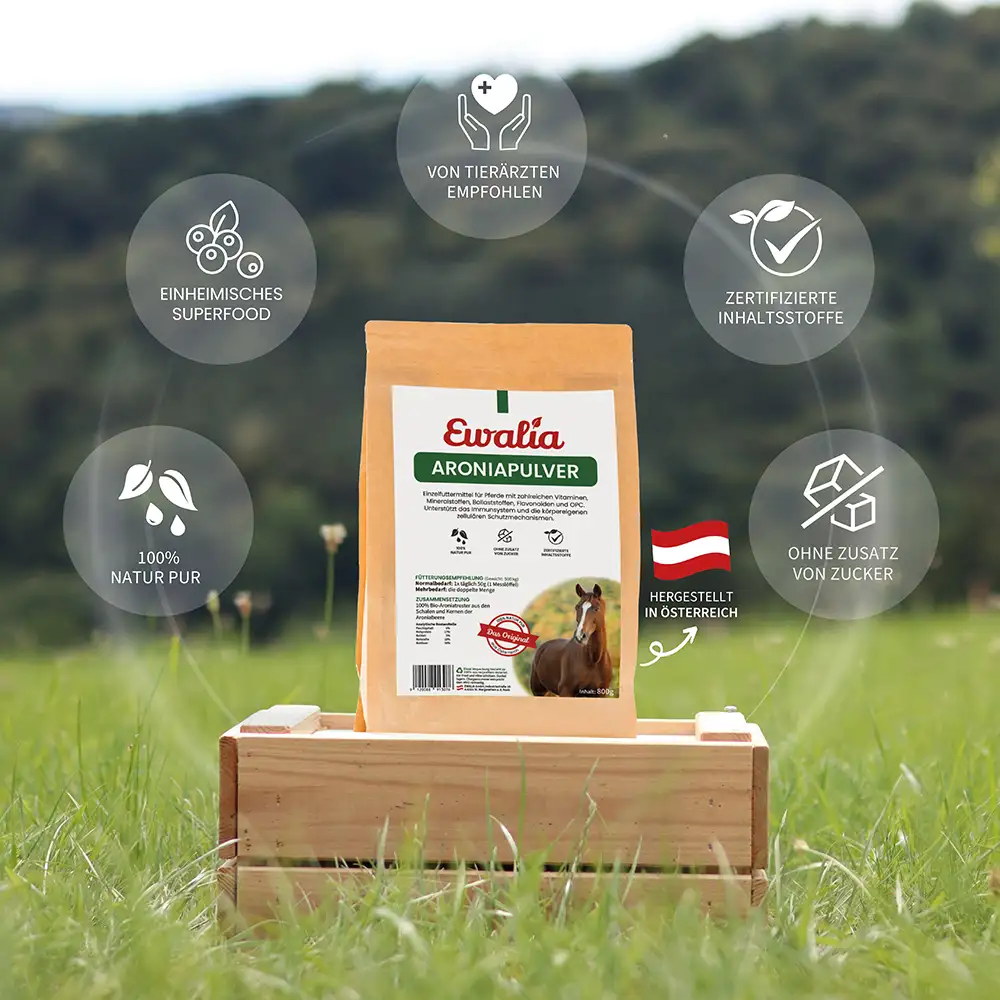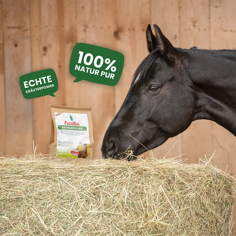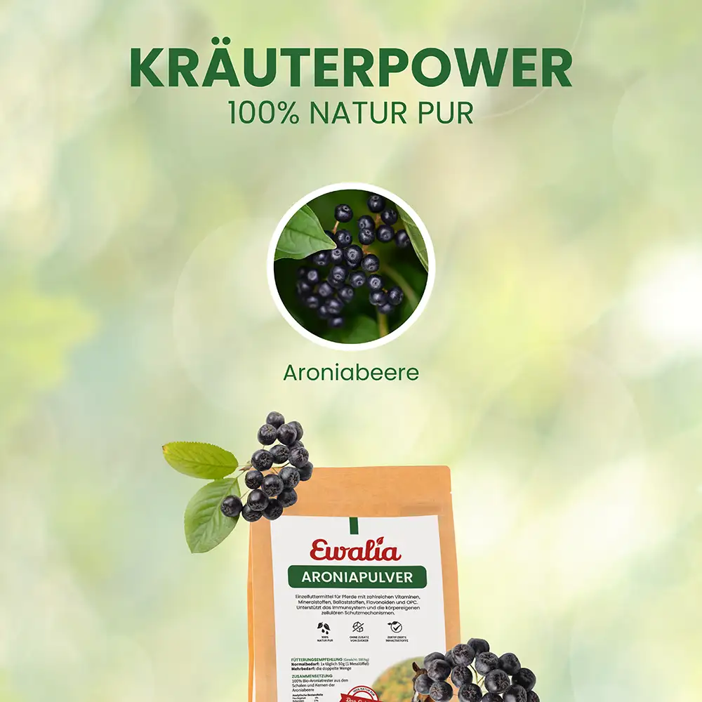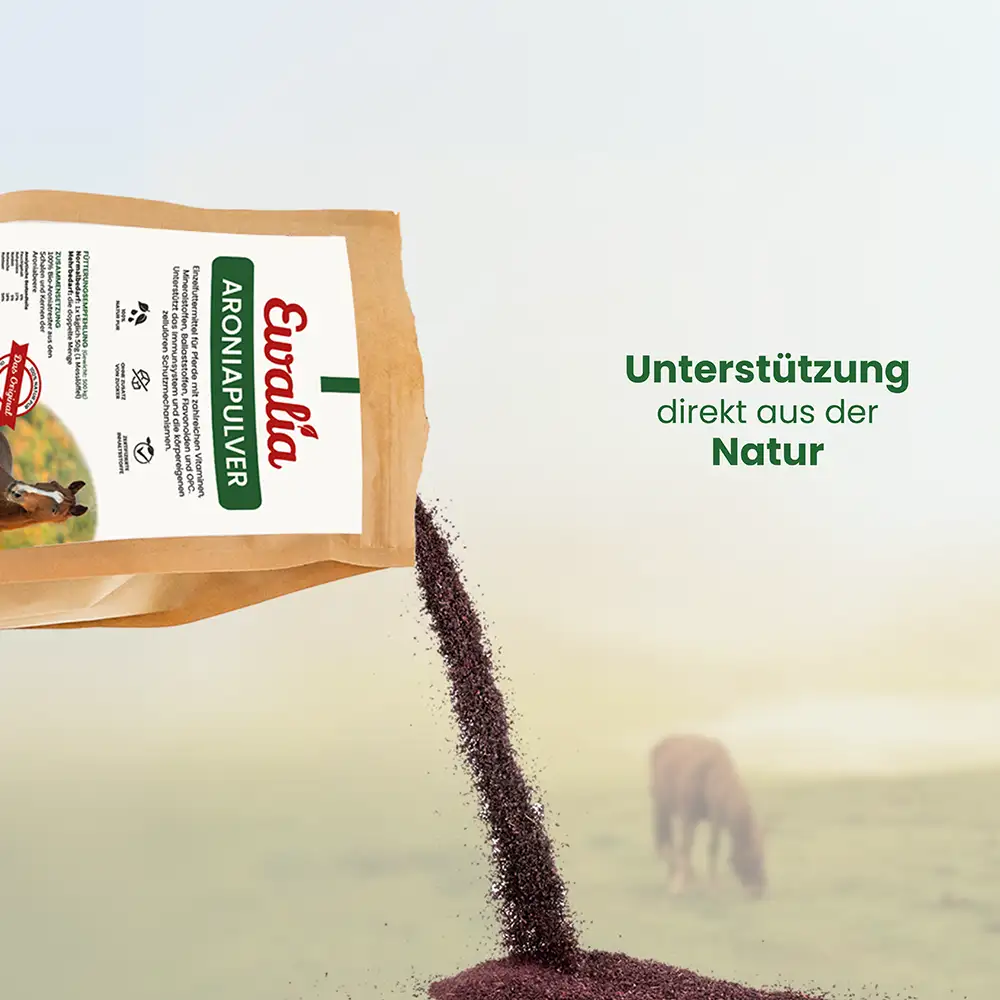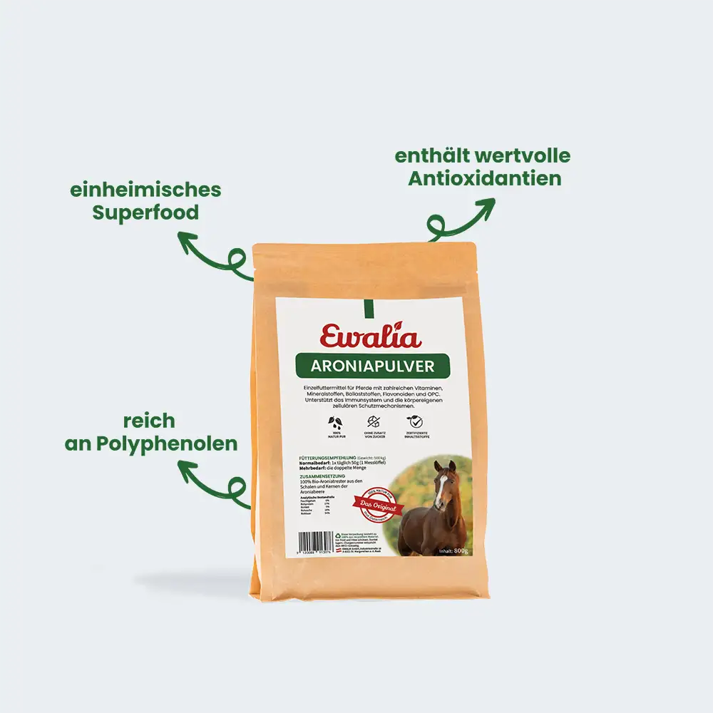 Das EWALIA Aroniapulver ist ein natürliches Ergänzungsfuttermittel für Pferde. Die Beeren sind reich an Polyphenolen und sekundären Pfl anzenstoffen, die traditionell für ihre antioxidativen Eigenschaften geschätzt werden. Aronia bereichert die Fütterung, fördert das Wohlbefi nden und wird traditionell mit der Unterstützung des Immunsystems sowie der Gesundheit von Haut, Fell und Hufen in Verbindung gebracht.