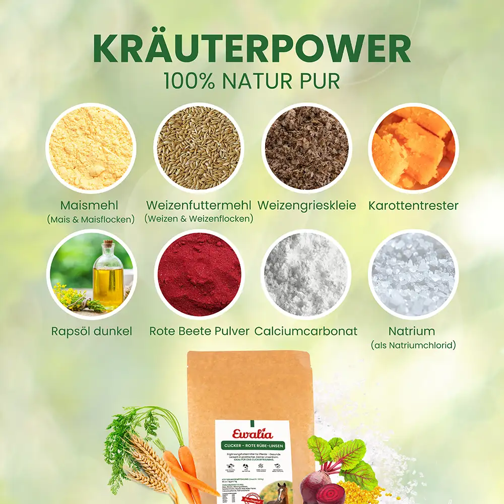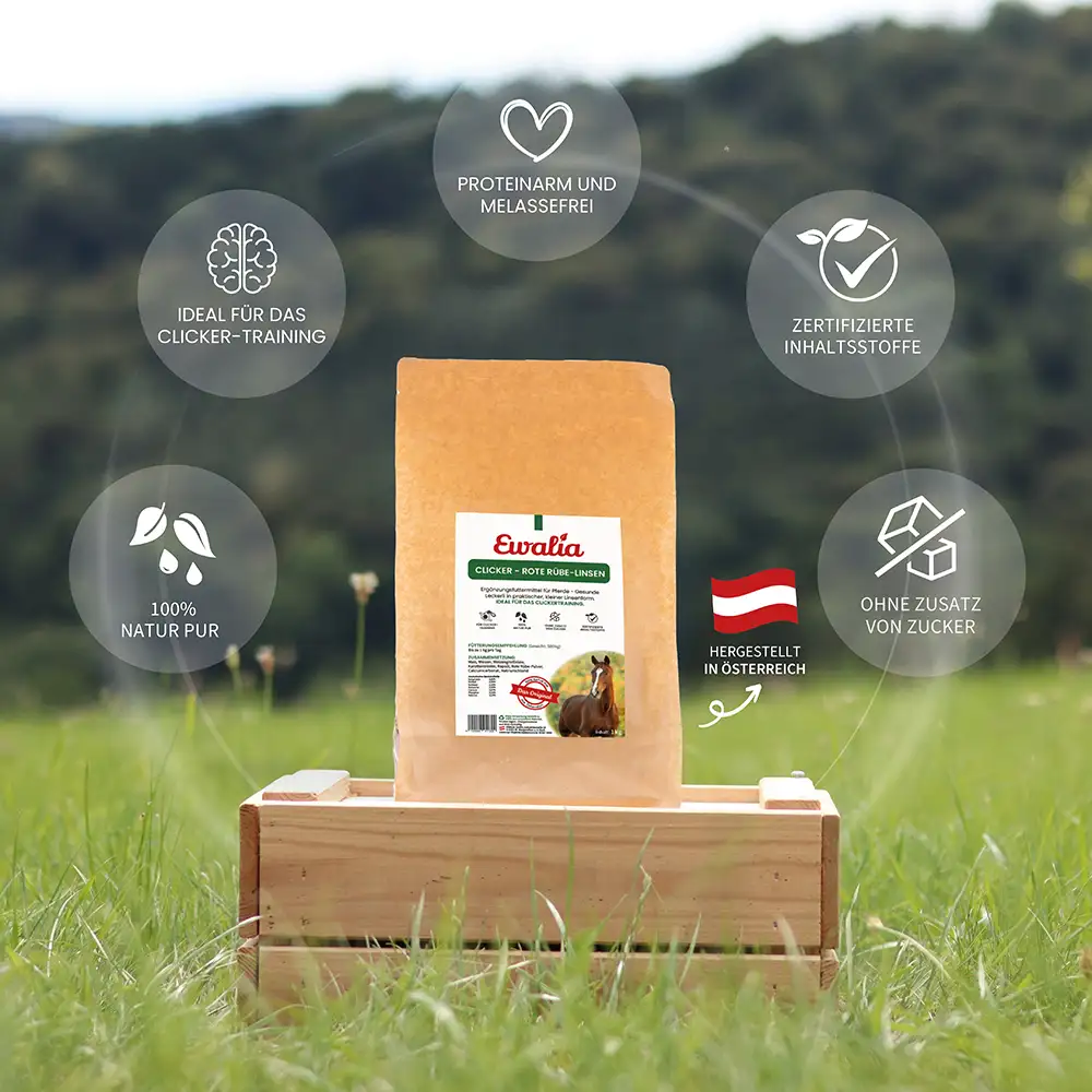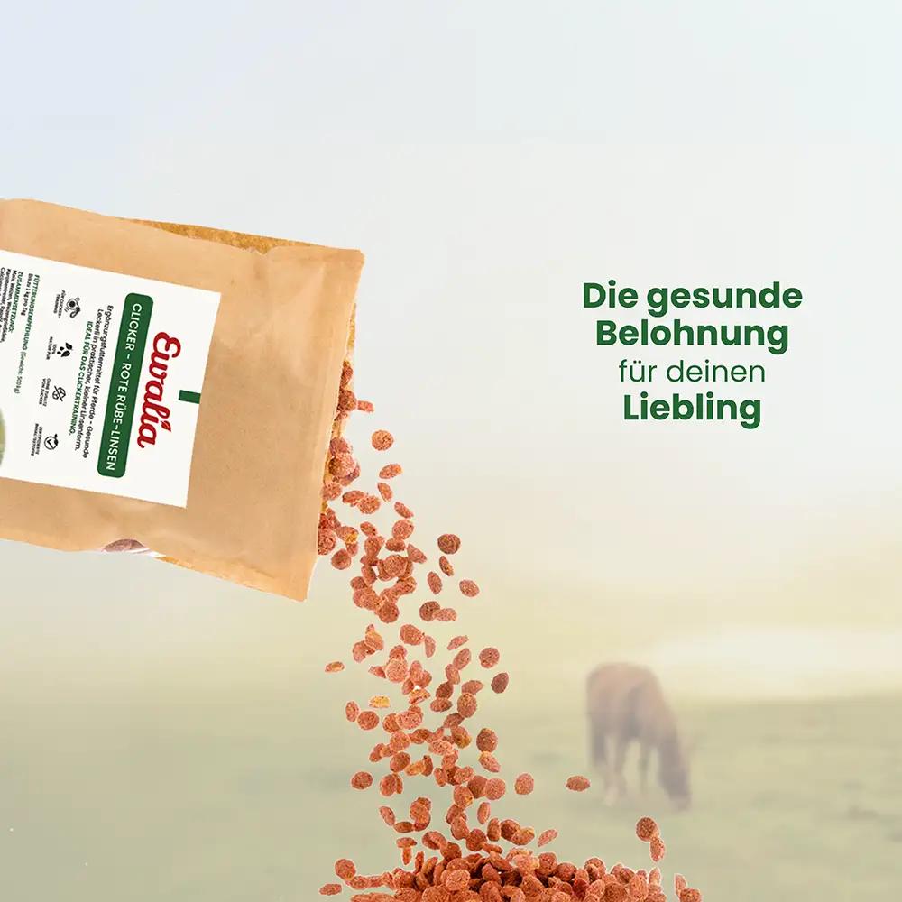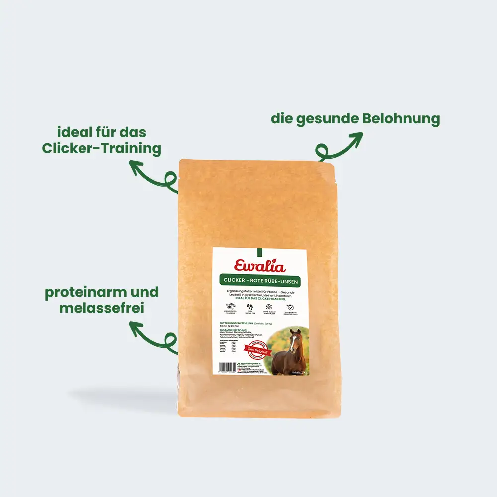 Die EWALIA Clicker – Rote Rübe-Linsen sind kleine Leckerbissen in handlicher Linsenform, die sich besonders gut für das Clicker-Training und die Arbeit mit Jungpferden eignen. Durch die kompakte Größe lassen sie sich kleinschrittig einsetzen und tragen dazu bei, das Training gezielt und strukturiert zu gestalten. Mit den natürlichen Zutaten Rote Rübe und Karotte bieten die Linsen eine schmackhafte Belohnung, die sich unkompliziert in den Trainingsalltag integrieren lässt. Die Rezeptur ist proteinarm und melassefrei, sodass sie bewusst und schonend gefüttert werden kann.