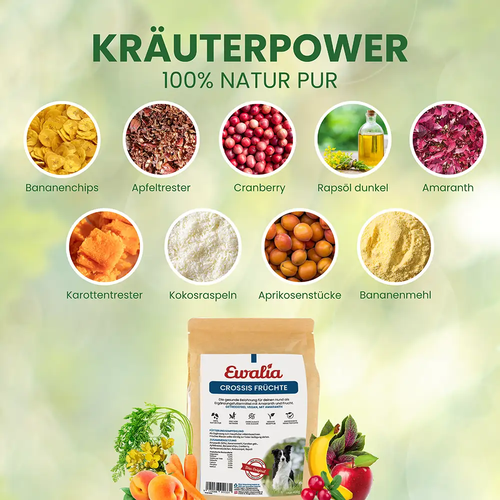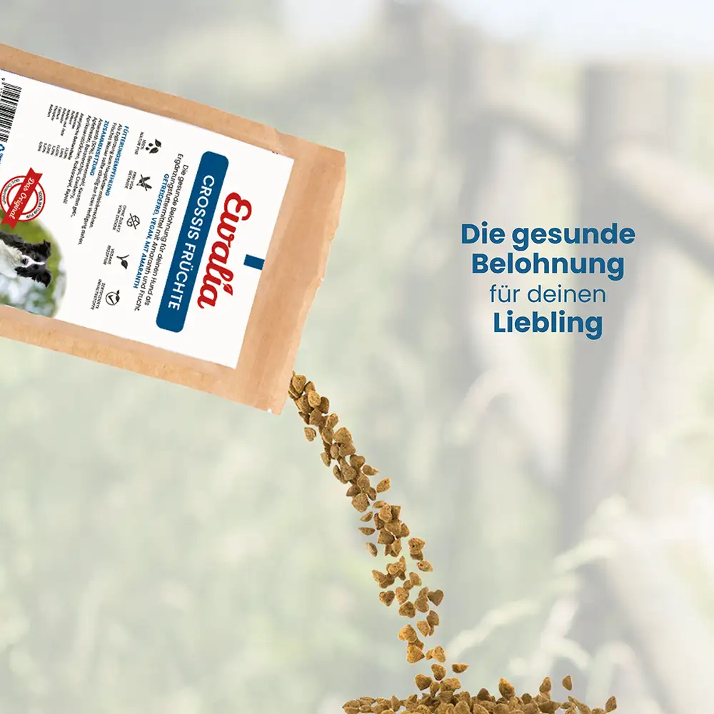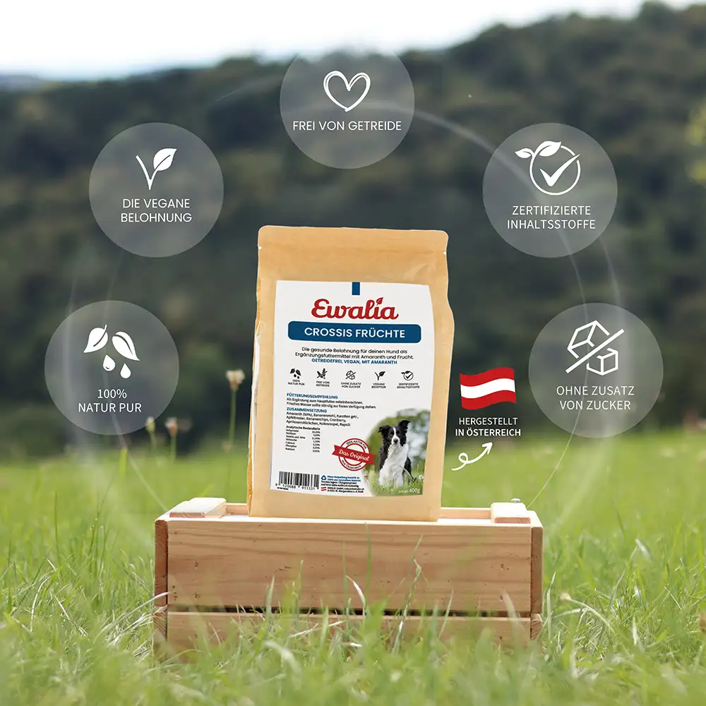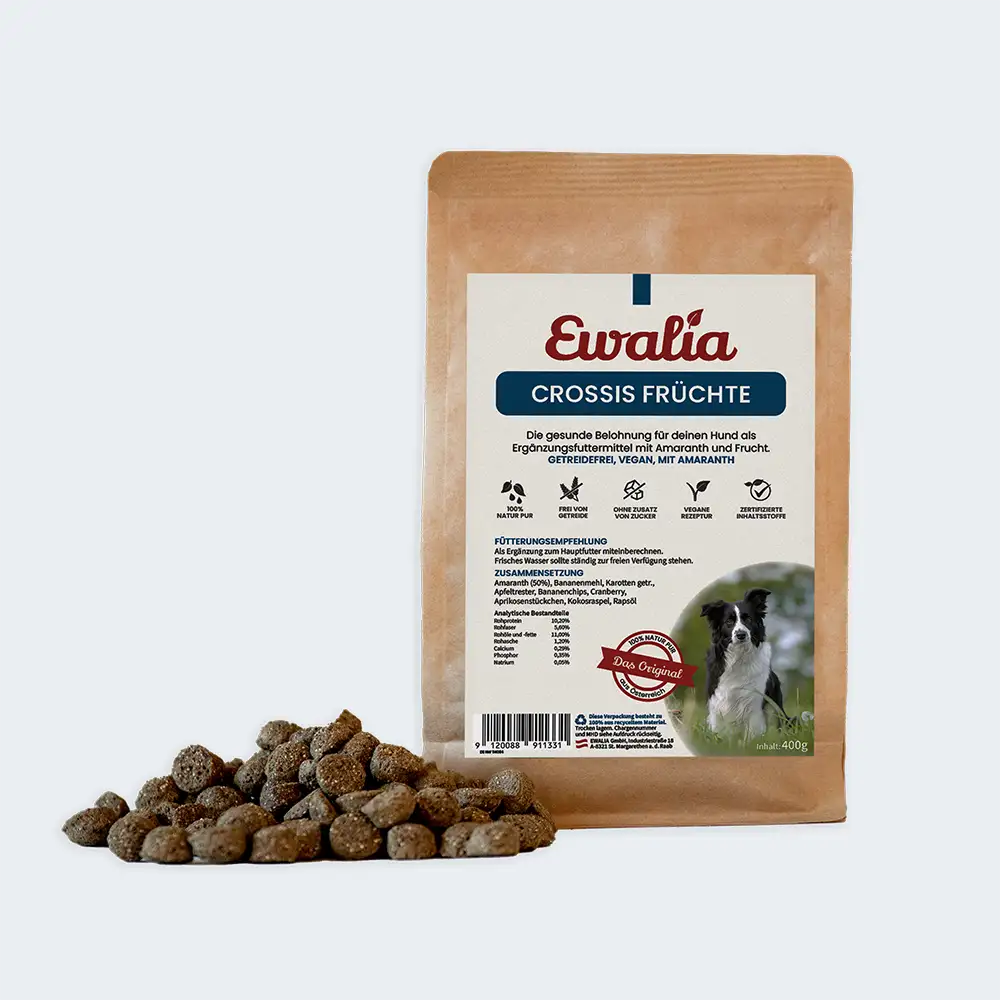EWALIA Crossis Früchte für Hunde sind kleine, vegane Snacks mit Amaranth und ausgewählten Früchten. Sie sind frei von Getreide, leicht bekömmlich und eignen sich als gesunde Belohnung für deinen Hund. Als Ergänzung zum Hauptfutter miteinberechnen.