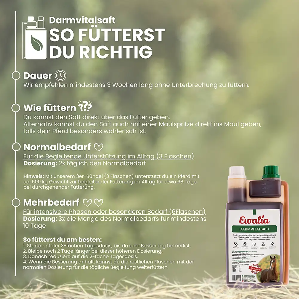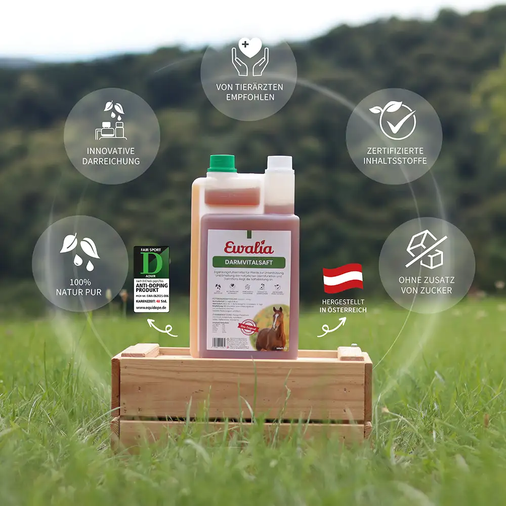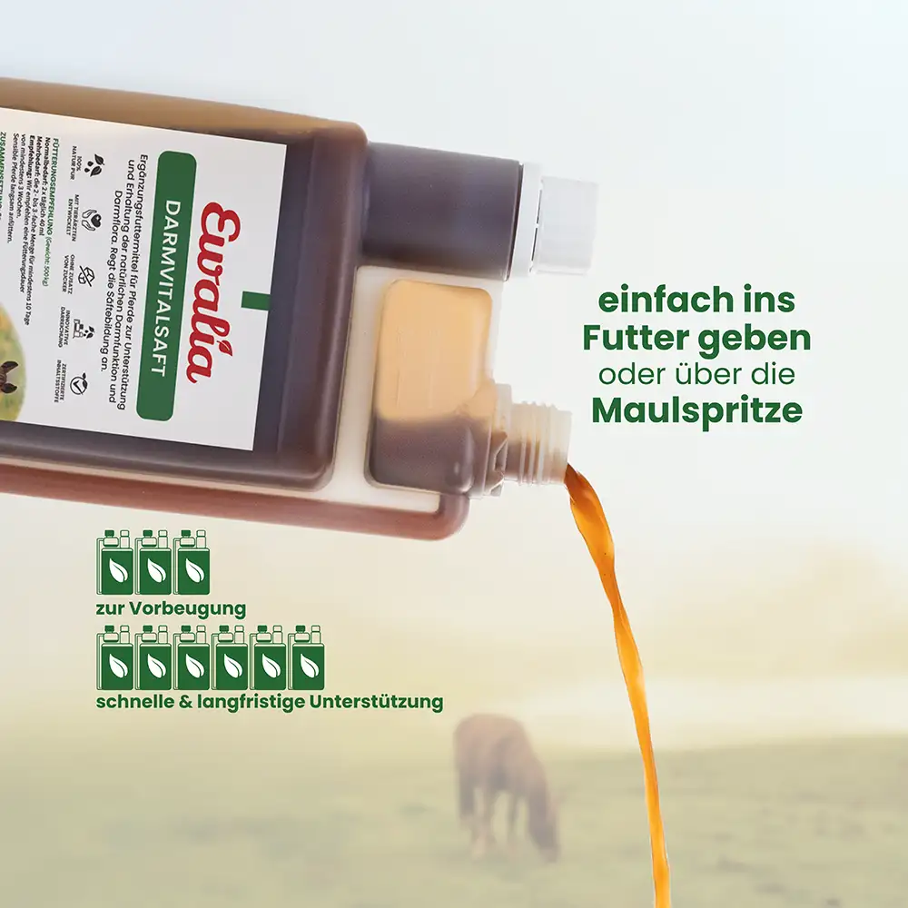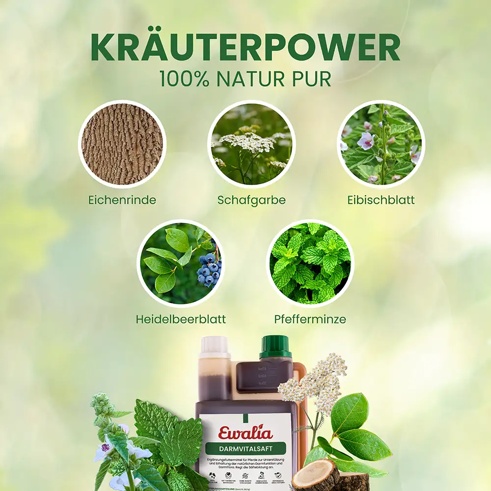 Der EWALIA Darmvitalsaft ist ein fl üssiges Ergänzungsfuttermittel mit sorgfältig ausgewählten Kräutern in Arzneibuchqualität. Eichenrinde und Heidelbeerblätter können zur Erhaltung einer gesunden Darmfunktion beitragen, während Schafgarbe und Pfefferminze die natürlichen Verdauungsprozesse begleiten. Eibischblätter werden traditionell geschätzt, um die Darmschleimhaut zu unterstützen und das allgemeine Wohlbefi nden zu fördern.