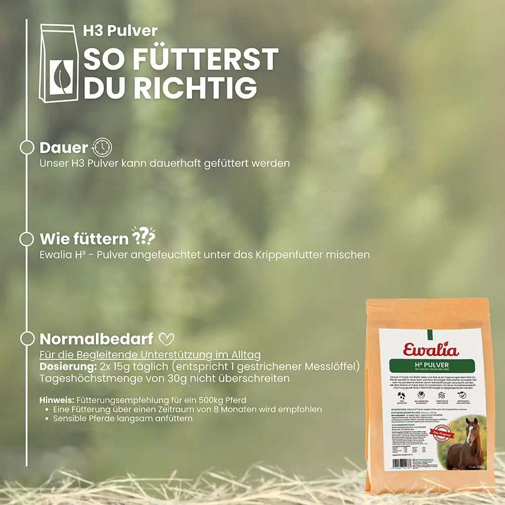 Das EWALIA H³ Pulver für Pferde ist ein Ergänzungsfuttermittel mit Biotin, Selen, Zink und weiteren Mineralstoffen. Diese Kombination ist speziell auf die Unterstützung von Haut, Fell und Hufen abgestimmt. Das äußere Erscheinungsbild von Hufen, Fell und Haut steht oft in engem Zusammenhang mit der Nährstoffversorgung – hier kann das H³ Pulver wertvolle Begleitung leisten. Vitamin E ergänzt die Rezeptur und trägt zum allgemeinen Wohlbefi nden bei. Besonders in Phasen erhöhter Beanspruchung oder zur täglichen Basisversorgung eignet es sich ideal – auch in Kombination mit dem EWALIA Basis Mineral.