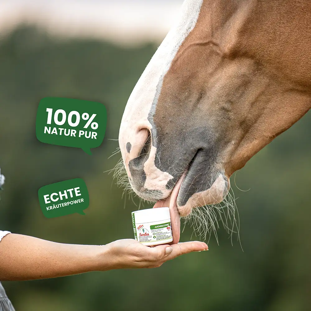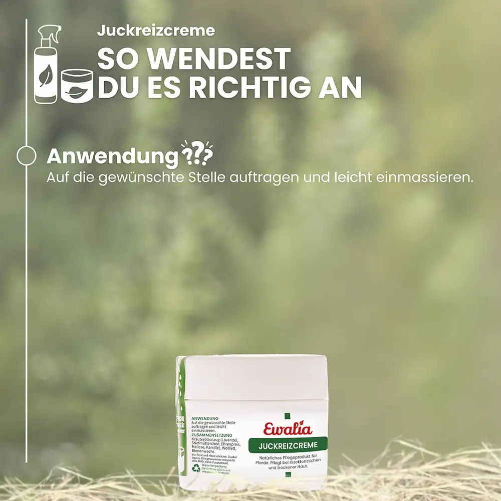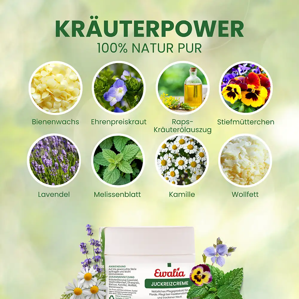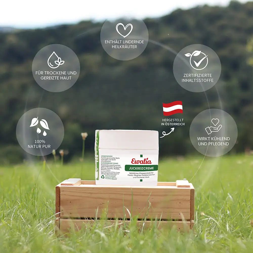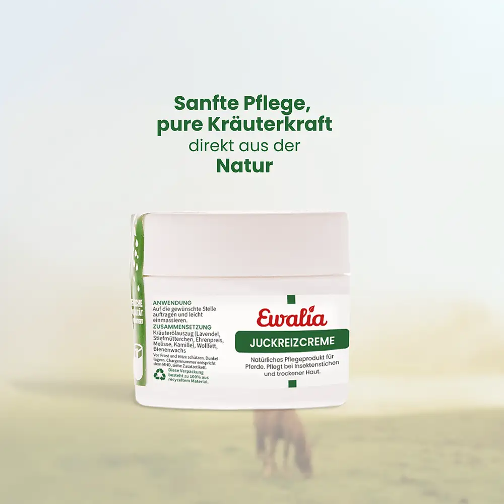 Die EWALIA Juckreiz-Creme ist eine sanfte Hautpflege für Pferde. Sie enthält wertvolle Kräuteröle, die seit langem traditionell im Zusammenhang mit der Hautpflege geschätzt werden. Die Creme kann beanspruchte Hautbereiche begleiten, mit einem erfrischenden Effekt pflegen und die tägliche Hautpflege auf natürliche Weise bereichern – auch in Zeiten, in denen Haut und Fell besonderen Belastungen wie Insektenkontakt ausgesetzt sind.