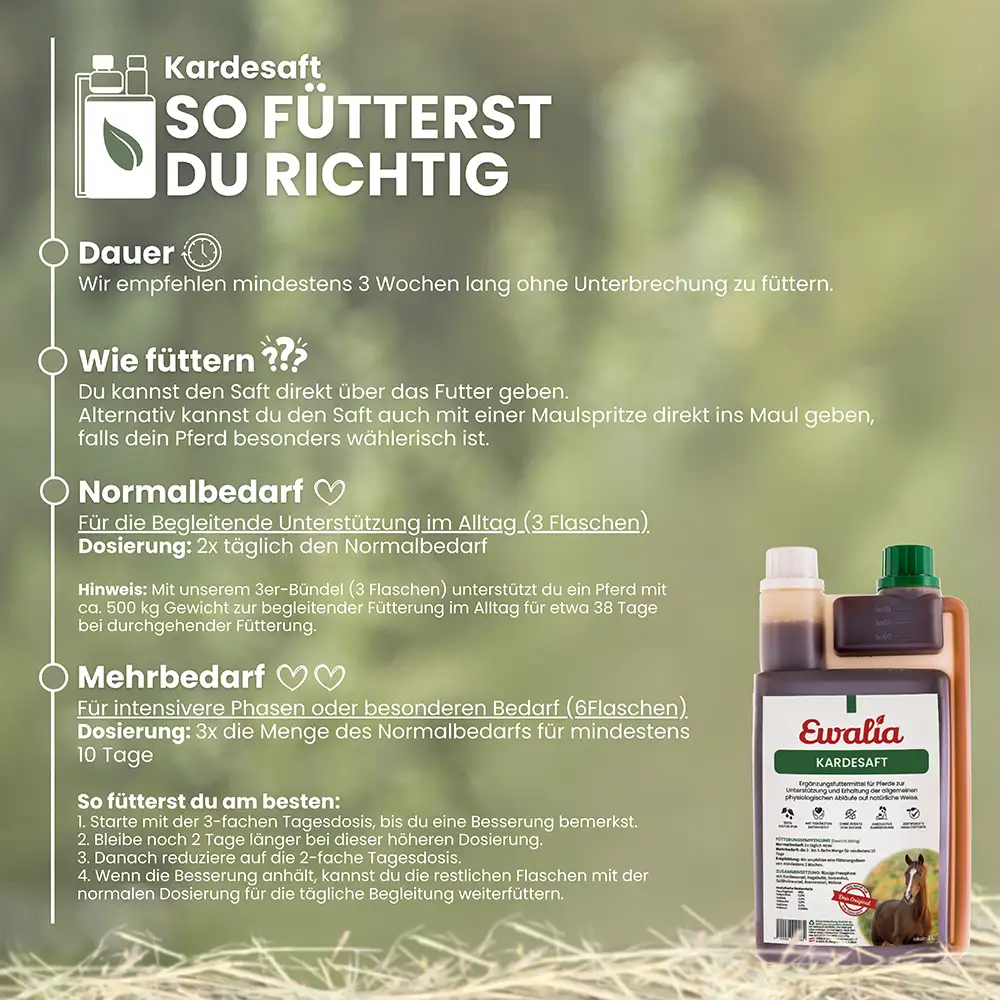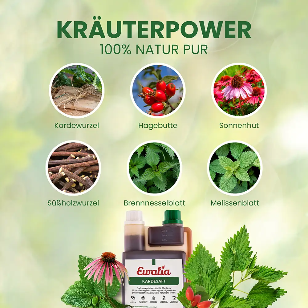 in Arzneibuchqualität. Die enthaltene Kardewurzel wird traditionell geschätzt, um Vitalität und Ausgeglichenheit zu fördern. Zusammen mit Hagebutte, Sonnenhut und Co. trägt sie zur Erhaltung der natürlichen Widerstandskraft bei und kann die physiologischen Abläufe im Körper unterstützen. So ist der Kardesaft eine wertvolle Ergänzung zur täglichen Fütterung – für mehr Balance und Wohlbefi nden deines Pferdes.