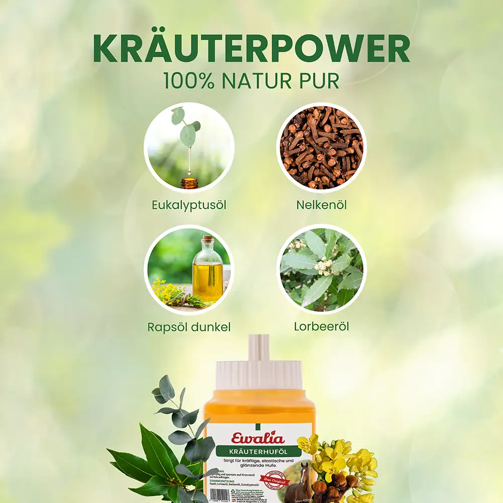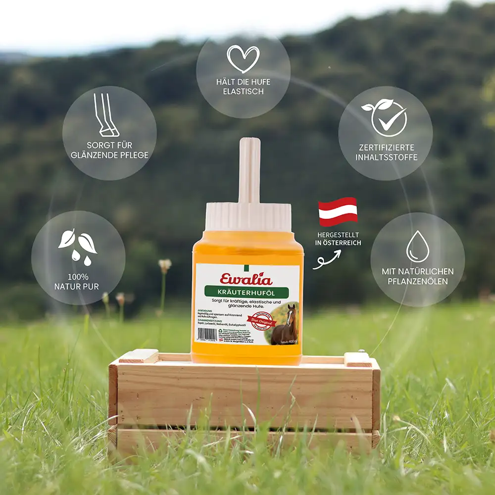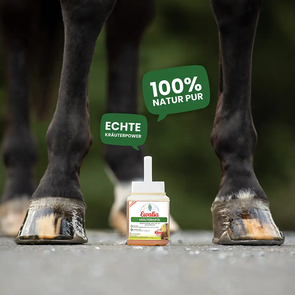 Das EWALIA Kräuterhuföl ist eine hochwertige Pflege für Pferdehufe. Mit sorgfältig ausgewählten Kräuterölen wird es im Zusammenhang mit der Hufpflege geschätzt. Es trägt dazu bei, dass die Hufe gepflegt wirken, ihre Elastizität bewahren und einen natürlichen Glanz zeigen. Lichtgeschützt und frostfrei lagern.