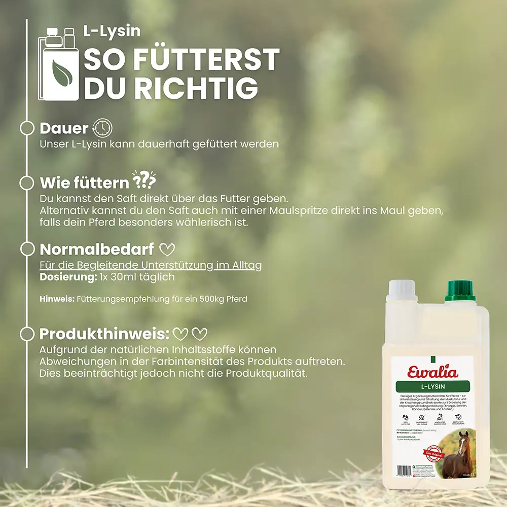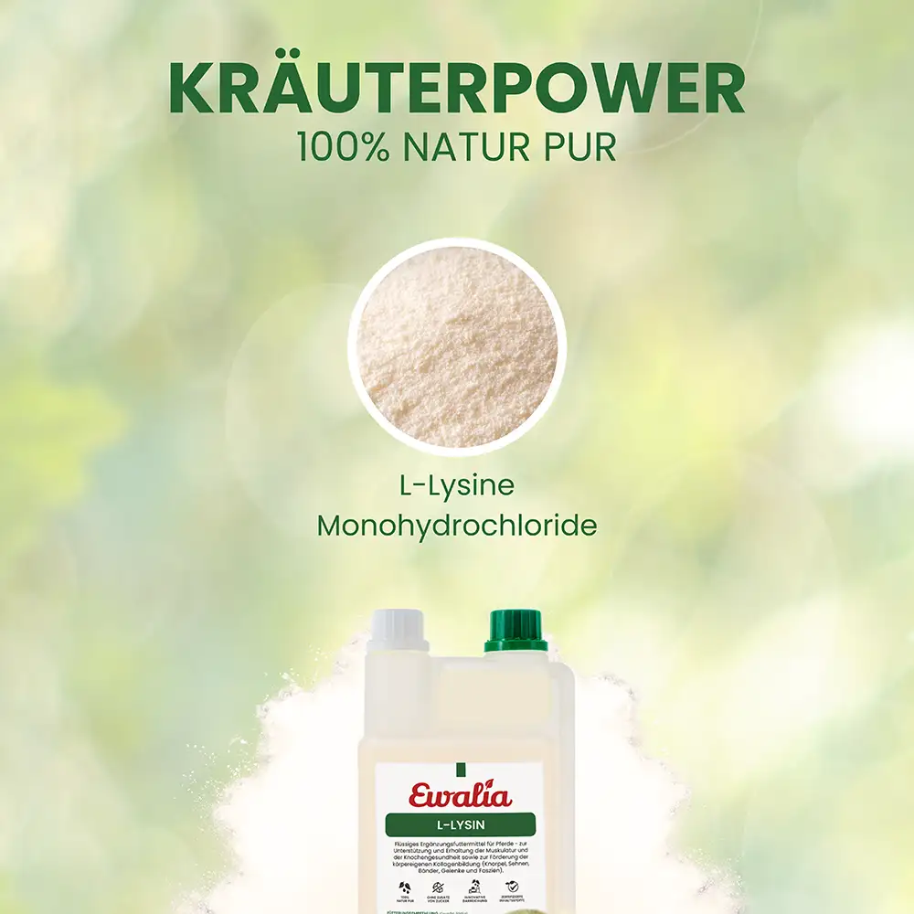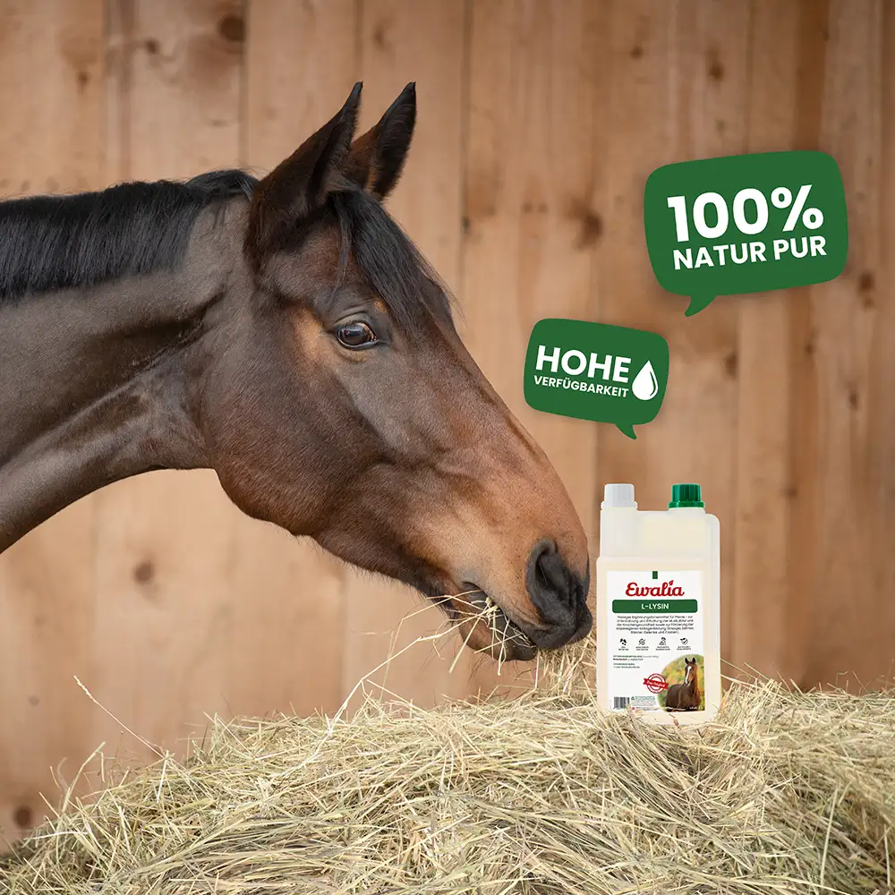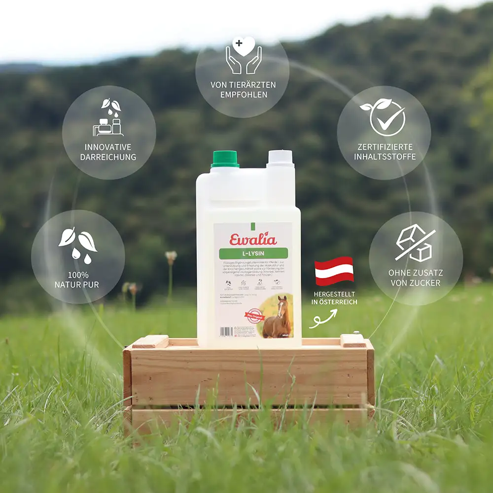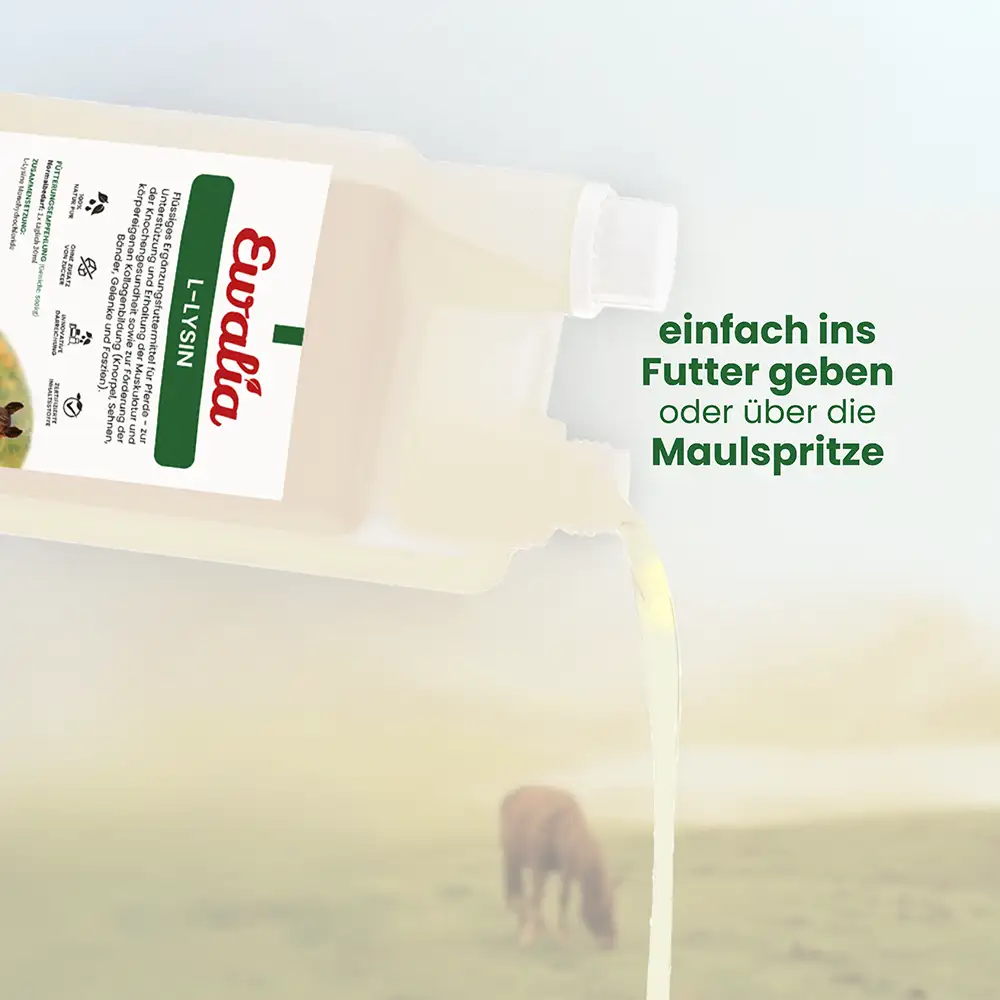 Das EWALIA L-Lysin Liquid für Pferde ist ein fl üssiges Ergänzungsfuttermittel und trägt zur Versorgung mit der essentiellen Aminosäure L-Lysin bei. L-Lysin wird traditionell im Zusammenhang mit Muskulatur, Knochen und dem gesamten Bewegungsapparat geschätzt. Außerdem ist es an natürlichen Prozessen der Kollagenbildung beteiligt, die in Knorpel, Sehnen, Bändern, Gelenken und Faszien eine Rolle spielen.