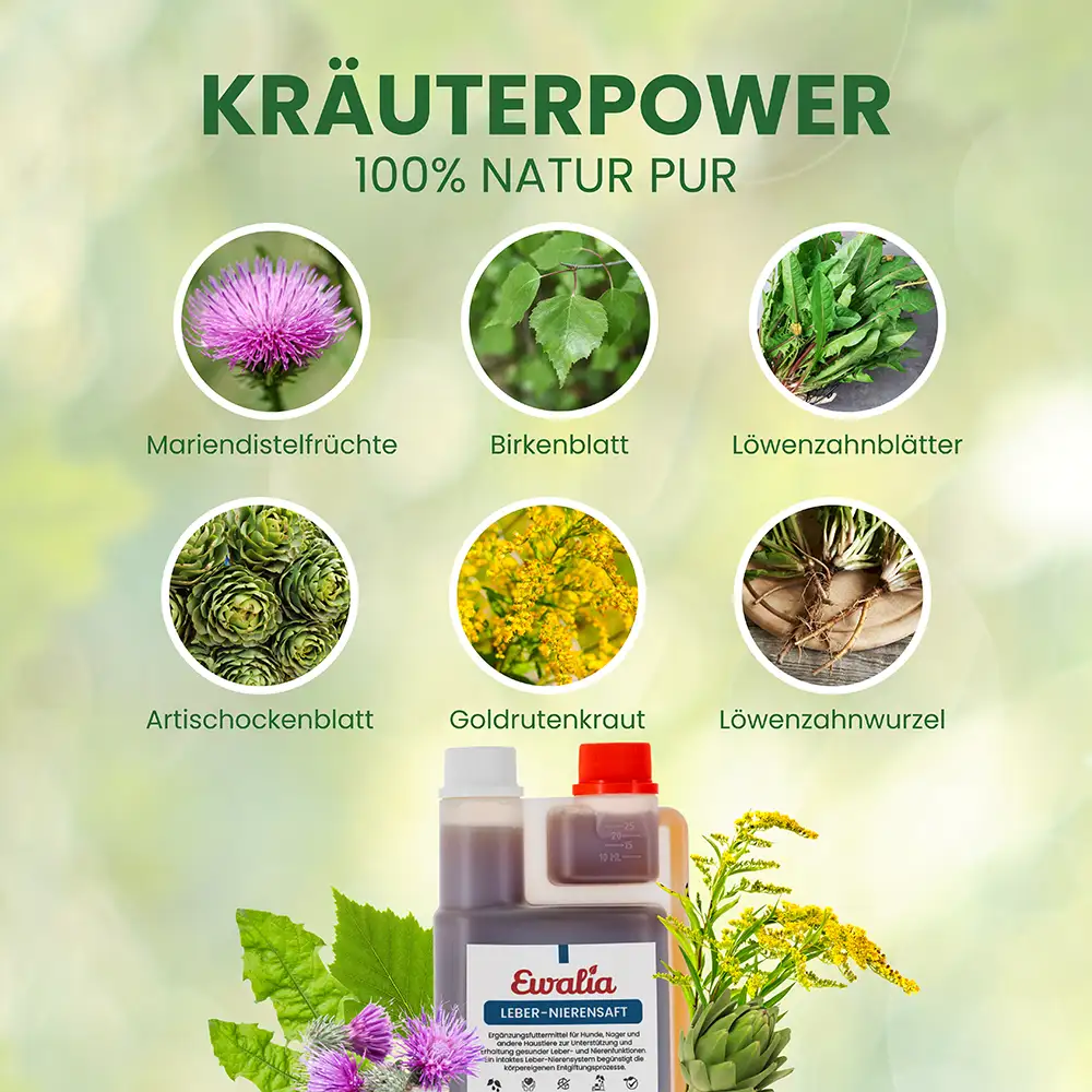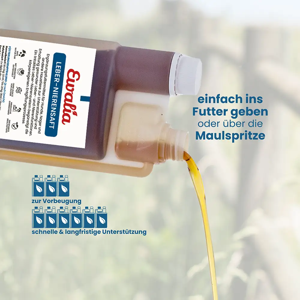 Der EWALIA Leber-Nierensaft ist ein flüssiges Ergänzungsfuttermittel mit sorgfältig ausgewählten Kräutern in Arzneibuchqualität. Mariendistelfrüchte und Artischockenblätter könne die natürlichen Entgiftungsprozesse von Leber und Nieren unterstützen. Birken- und Löwenzahnblätter sowie die Löwenzahnwurzel tragen zu einem gesunden Stoffwechsel bei und fördern damit das innere Gleichgewicht. Die ausgewogene Kräuterkombination kann das Immunsystem begleiten und die natürliche Widerstandskraft deines Hundes von innen heraus unterstützen – besonders in Phasen erhöhter Belastung.