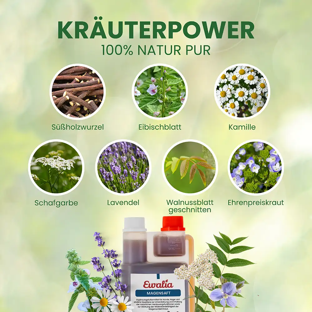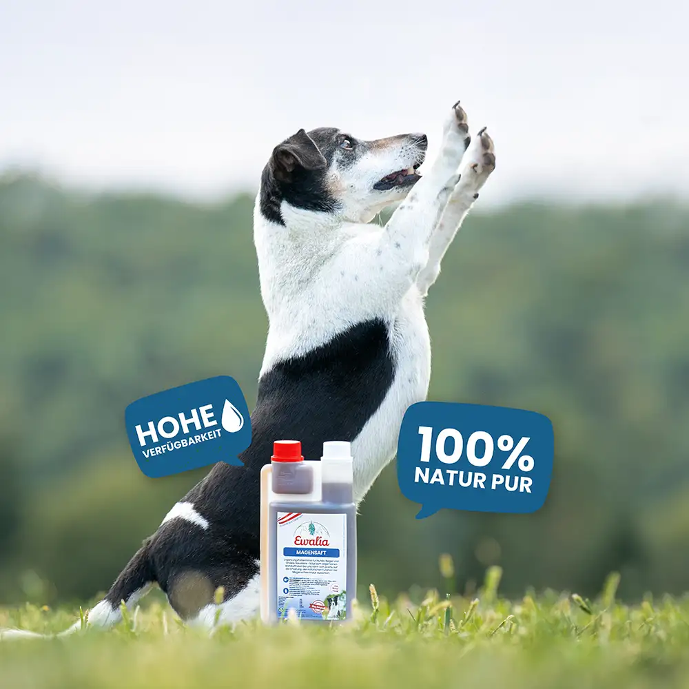 Der EWALIA Magensaft ist ein flüssiges Ergänzungsfuttermittel zur Unterstützung der natürlichen Magen-Darmfunktionen. Dank seines Gehalts an schleimbildenden Pflanzenstoffen wie Eibisch eignet er sich besonders für Hunde mit sensiblem Magen. Die Rezeptur begleitet die täglichen Fütterungsroutinen und ist ideal in Situationen wie Futterumstellungen, längeren Fresspausen oder erhöhter Belastung. So trägt der Magensaft I dazu bei, das Wohlbefinden des Hundes zu unterstützen.