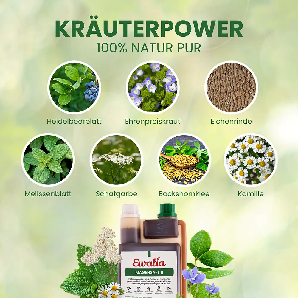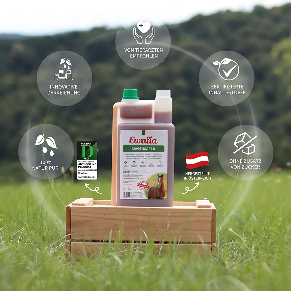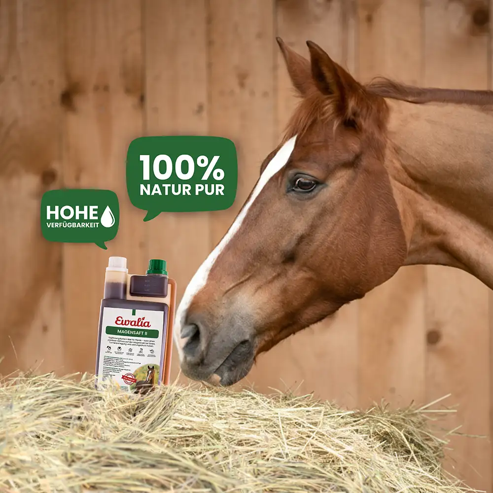 Der EWALIA Magensaft I ist ein fl üssiges Ergänzungsfuttermittel zur Unterstützung der natürlichen Magen-Darmfunktionen. Dank seines Gehalts an schleimbildenden Pfl anzenstoffen wie Eibisch eignet er sich besonders für Pferde mit sensiblem Magen. Die Rezeptur begleitet die täglichen Fütterungsroutinen und ist ideal in Situationen wie Futterumstellungen, längeren Fresspausen oder erhöhter Belastung. So trägt der Magensaft I dazu bei, das Wohlbefi nden des Pferdes zu unterstützen.