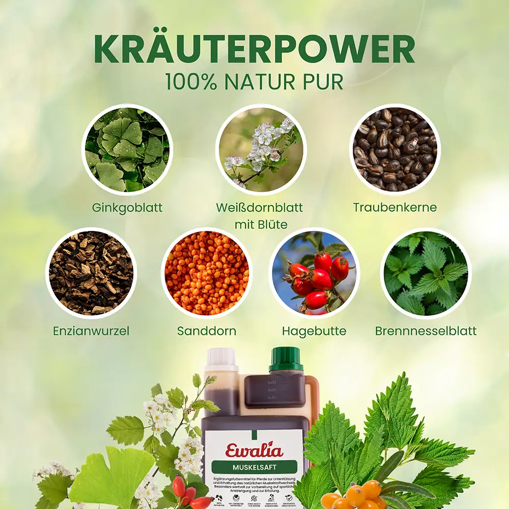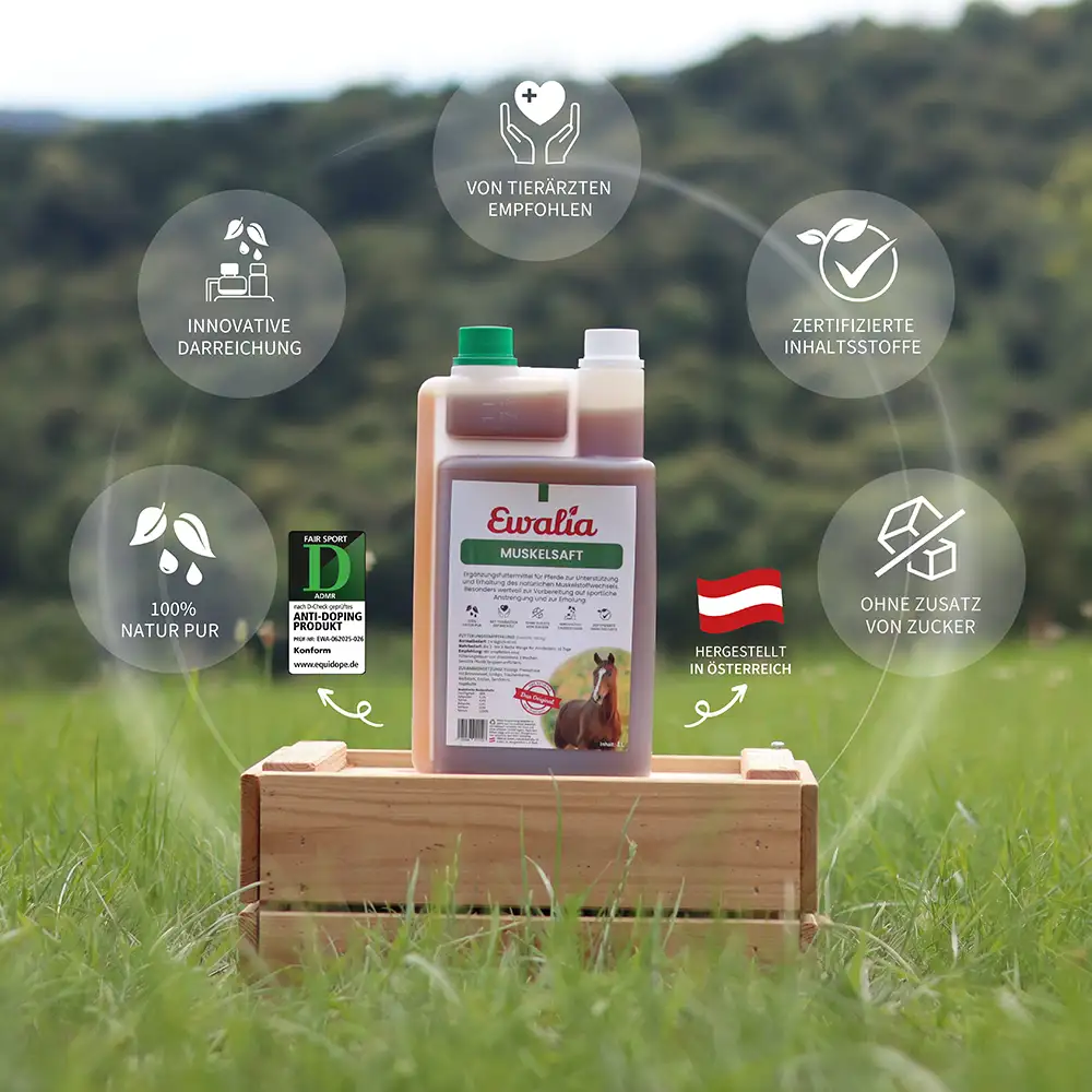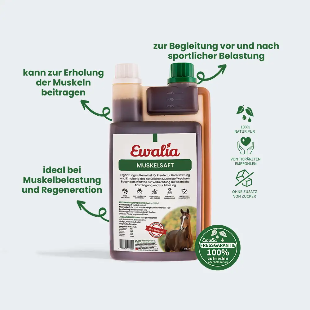 Der EWALIA Muskelsaft ist ein fl üssiges Ergänzungsfuttermittel mit ausgewählten Kräutern in Arzneibuchqualität. Er eignet sich sowohl für Sportpferde im intensiven Training als auch für Freizeitpferde, deren Muskulatur regelmäßig beansprucht wird. Die Rezeptur begleitet den Organismus in Phasen von Aufbau, Belastung und Erholung und trägt dazu bei, Vitalität, Ausdauer und Bewegungsfreude zu erhalten. Damit ist der Muskelsaft eine wertvolle Ergänzung zur täglichen Fütterung, wenn die Muskulatur besondere Unterstützung braucht.