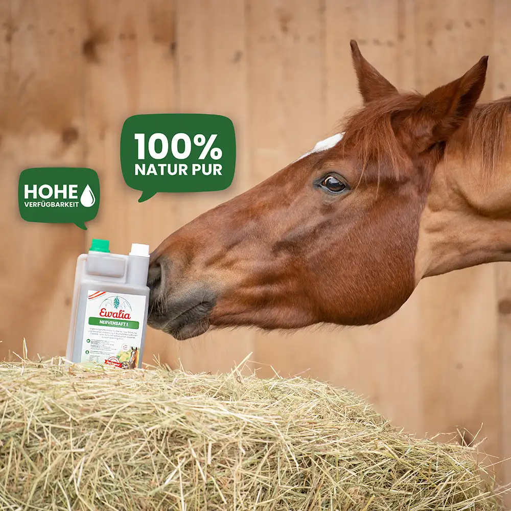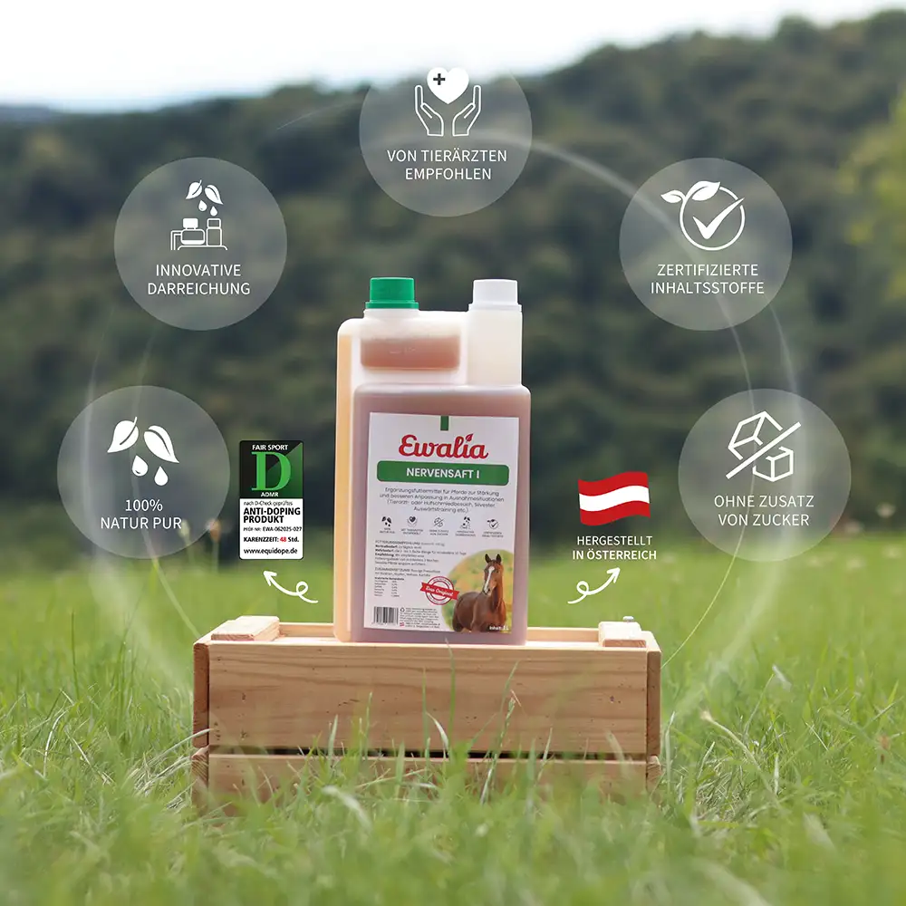 Der EWALIA Nervensaft I ist ein fl üssiges Ergänzungsfuttermittel mit sorgfältig ausgewählten Kräutern in Arzneibuchqualität. Baldrianwurzel, Hopfenzapfen und Melissenblätter werden traditionell für ihre harmonisierenden Eigenschaften geschätzt und können zu mehr Ausgeglichenheit beitragen. Kamille rundet die Mischung ab und unterstützt das allgemeine Wohlbefinden. Diese Kombination eignet sich besonders für Pferde, die in Situationen wie Tierarzt- oder Hufschmiedbesuchen, Silvester, Auswärtstraining oder Boxenruhe mehr Gelassenheit benötigen.