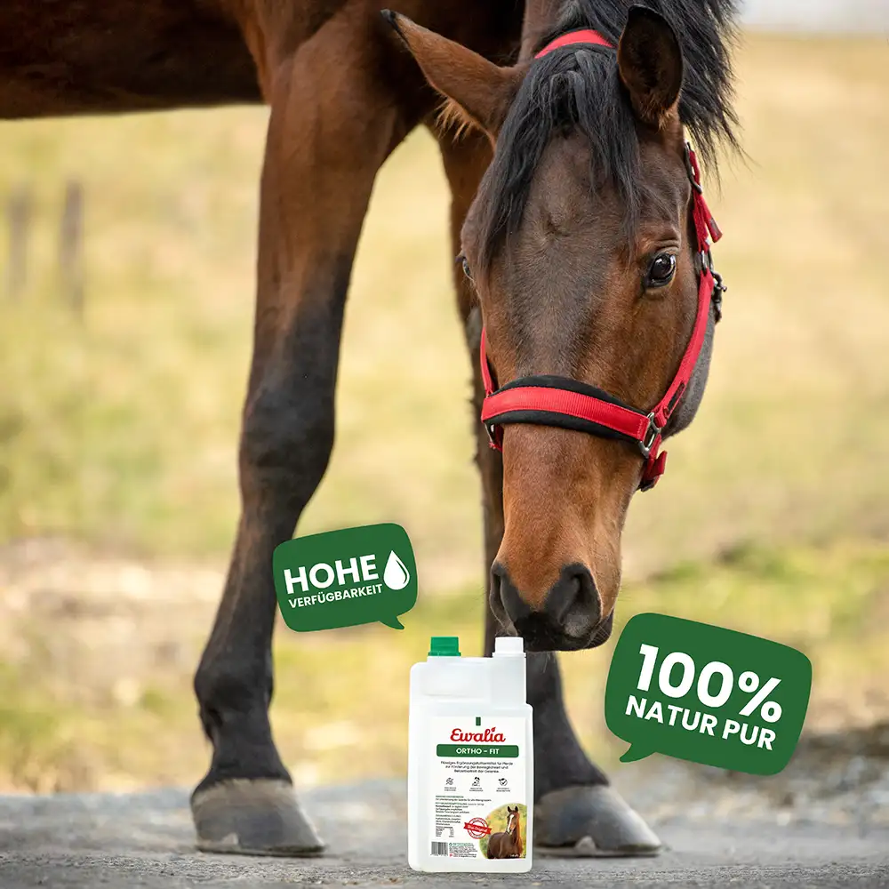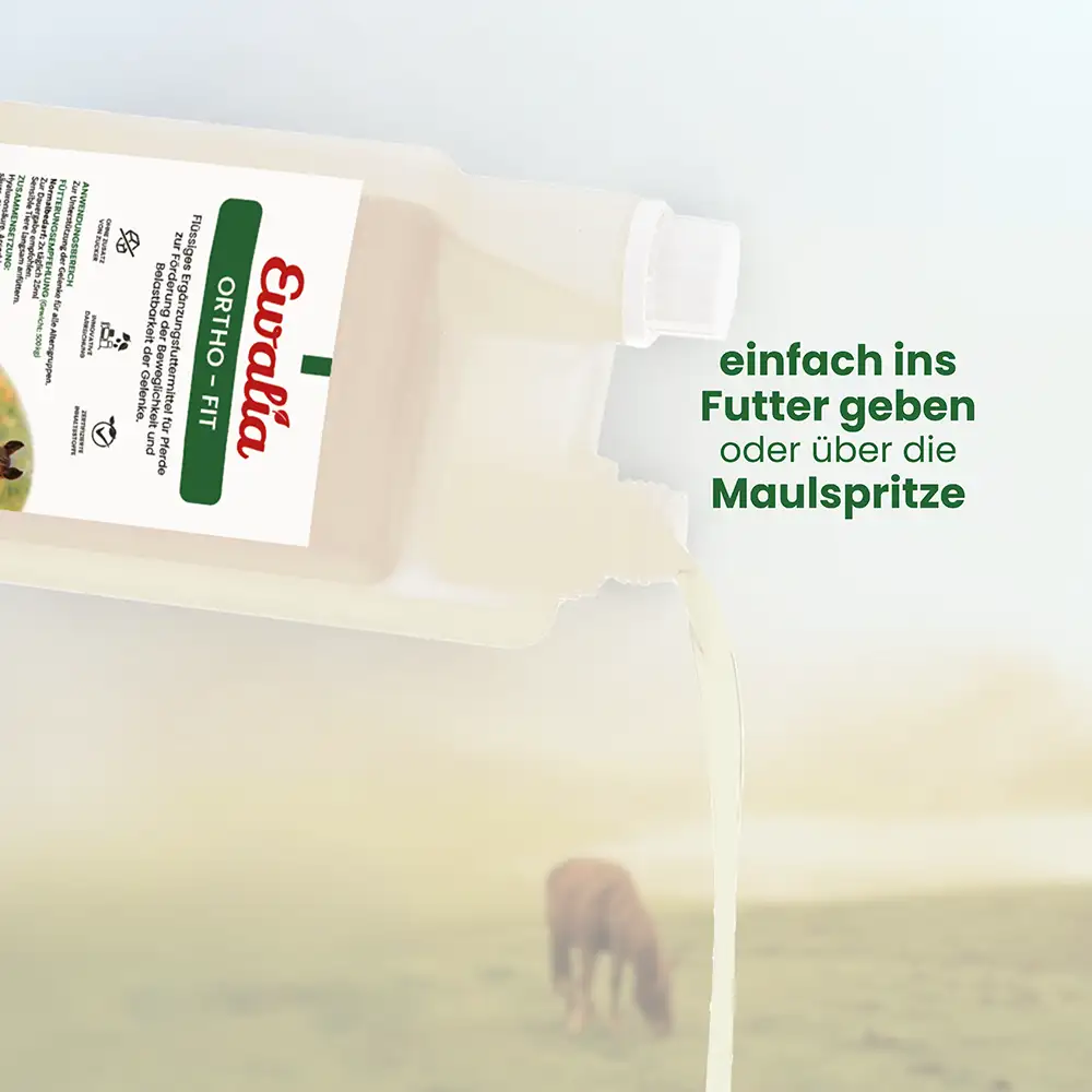 Das EWALIA Ortho-Fit ist ein flüssiges Ergänzungsfuttermittel zur Förderung der Beweglichkeit und Belastbarkeit der Gelenke bei besonderer Beanspruchung. Die Kombination aus Chondroitinsulfat und Hyaluronsäure ist die optimale Unterstützung zur Steigerung der Belastungsfähigkeit im Leistungssport oder bei besonderen Belastungen der Gelenke durch altersbedingte Verschleißerscheinungen sowie in der Regeneration.