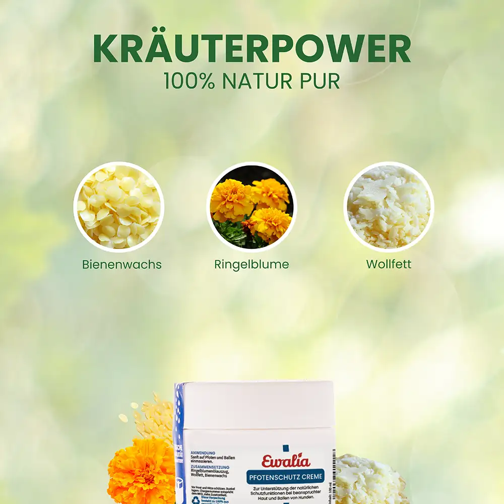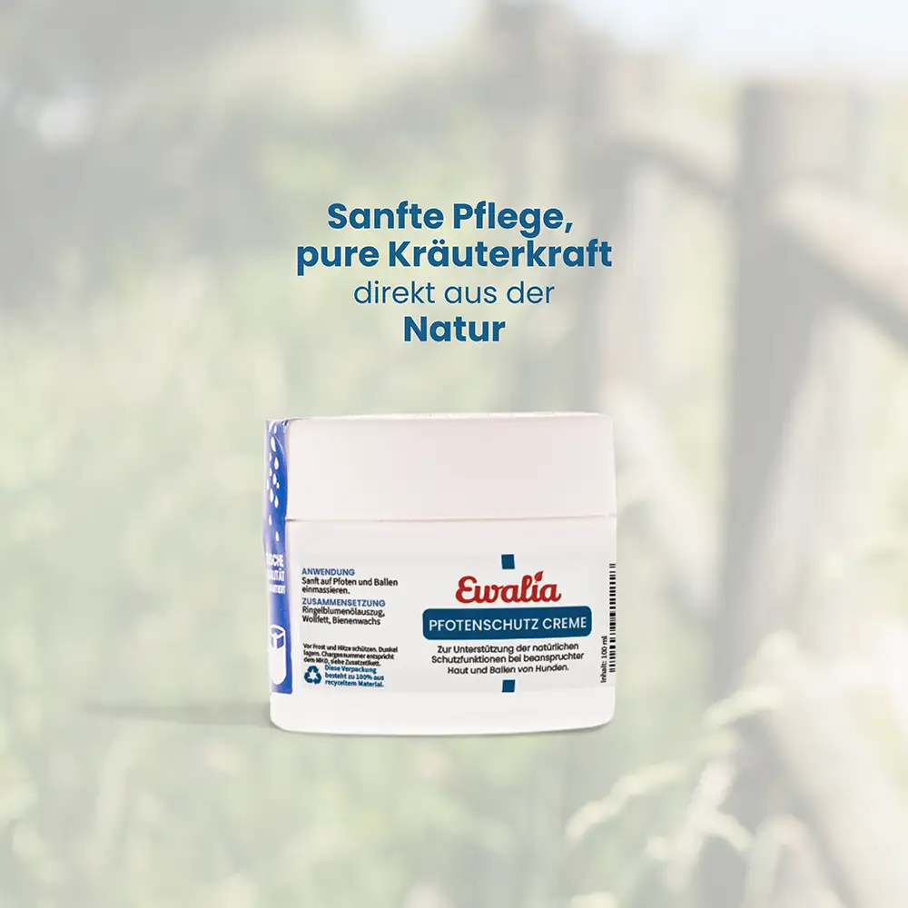 Die EWALIA Pfotenschutz Creme für Hunde ist eine natürliche Pfl egecreme mit Wollfett und Bienenwachs, verfeinert mit Ringelblume. Sie begleitet die natürlichen Schutzfunktionen der Haut und eignet sich besonders für stark beanspruchte Pfoten und Ballen – etwa nach langen Spaziergängen oder bei rauem Untergrund. Durch ihre reichhaltige Textur hilft sie, die Hautfeuchtigkeit zu bewahren und trägt dazu bei, die Ballen geschmeidig zu halten.