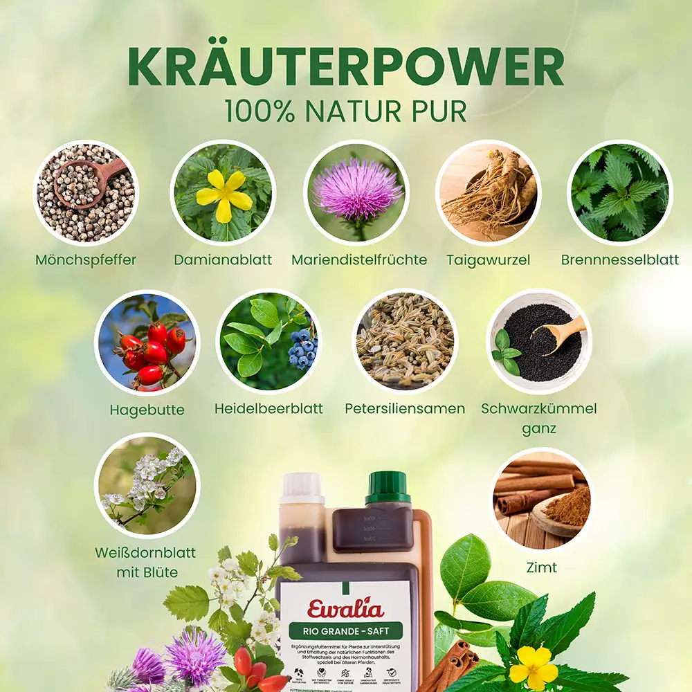Der EWALIA Rio Grande-Saft ist ein fl üssiges Ergänzungsfuttermittel mit ausgewählten Kräutern in Arzneibuchqualität. Er wurde speziell für Pferde entwickelt, deren Organismus im Alter besonderen Anforderungen unterliegt – sei es durch hormonelle Veränderungen, verlangsamte Stoffwechselprozesse oder einen erschwerten Fellwechsel. Die Rezeptur wird traditionell im Zusammenhang mit Vitalität, innerem Gleichgewicht und einem gesunden Energiehaushalt geschätzt. Damit eignet sich der Rio Grande-Saft als wertvolle Ergänzung zur täglichen Fütterung, um ältere Pferde sanft zu begleiten und ihr Wohlbefi nden langfristig zu fördern.