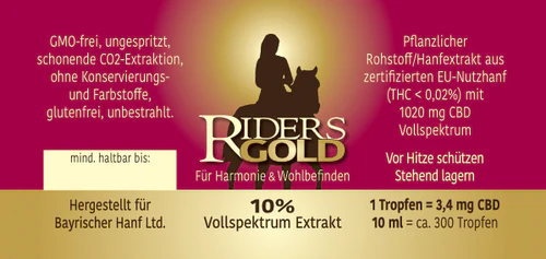 Ridersgold ist ein hochwertiges Vollspektrum-CBD. Dies unterstützt den Körper in seiner Selbstregulation, macht den Kopf frei und entspannt.