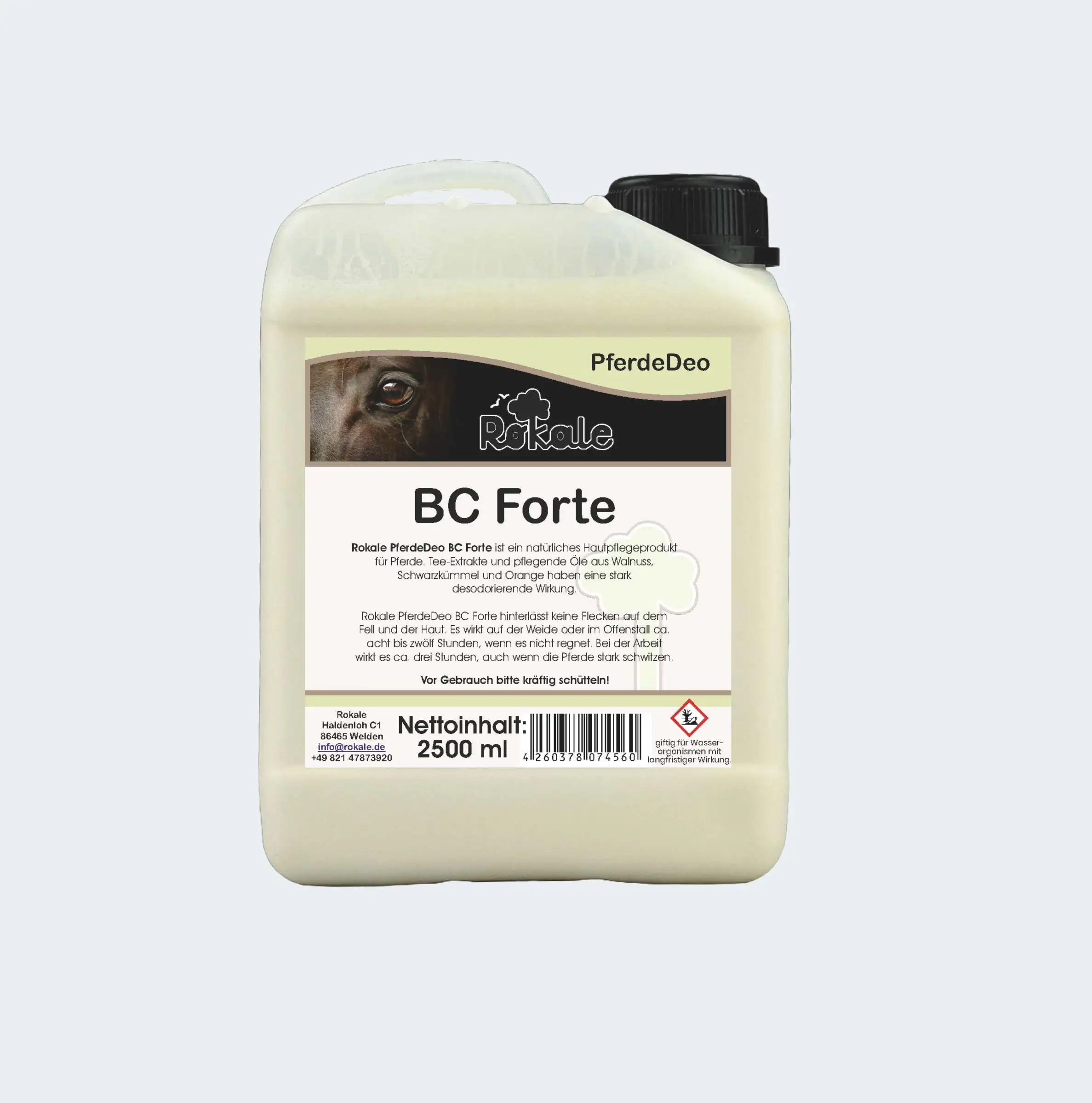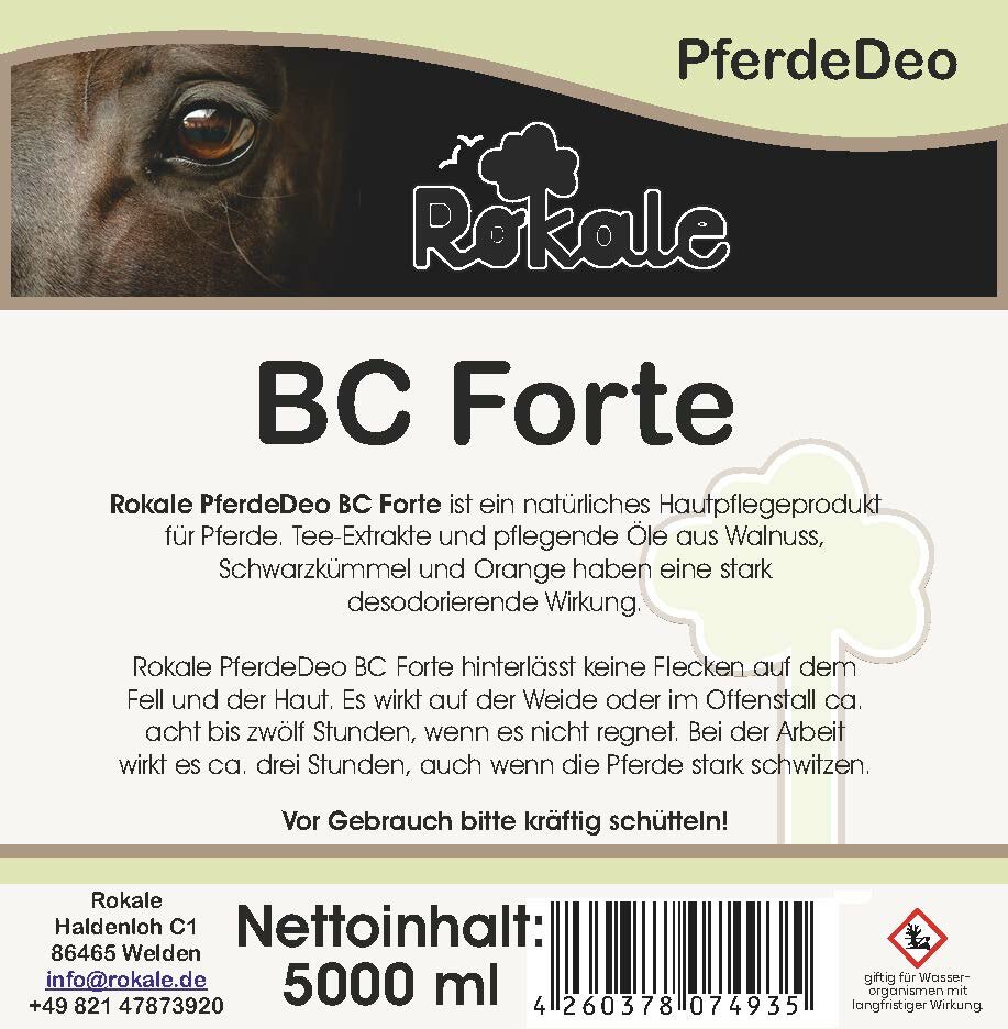 Rokale PferdeDeo BC Forte ist ein natürliches Hautpflegeprodukt für Pferde. Tee-Extrakte und pflegende Öle aus Walnuss, Schwarzkümmel und Orange haben eine stark desodorierende Wirkung. Rokale PferdeDeo BC Forte hinterlässt keine Flecken auf dem Fell und der Haut. Es wirkt auf der Weide oder im Offenstall ca. acht bis zwölf Stunden, wenn es nicht regnet. Bei der Arbeit wirkt es ca. drei Stunden, auch wenn die Pferde stark schwitzen.