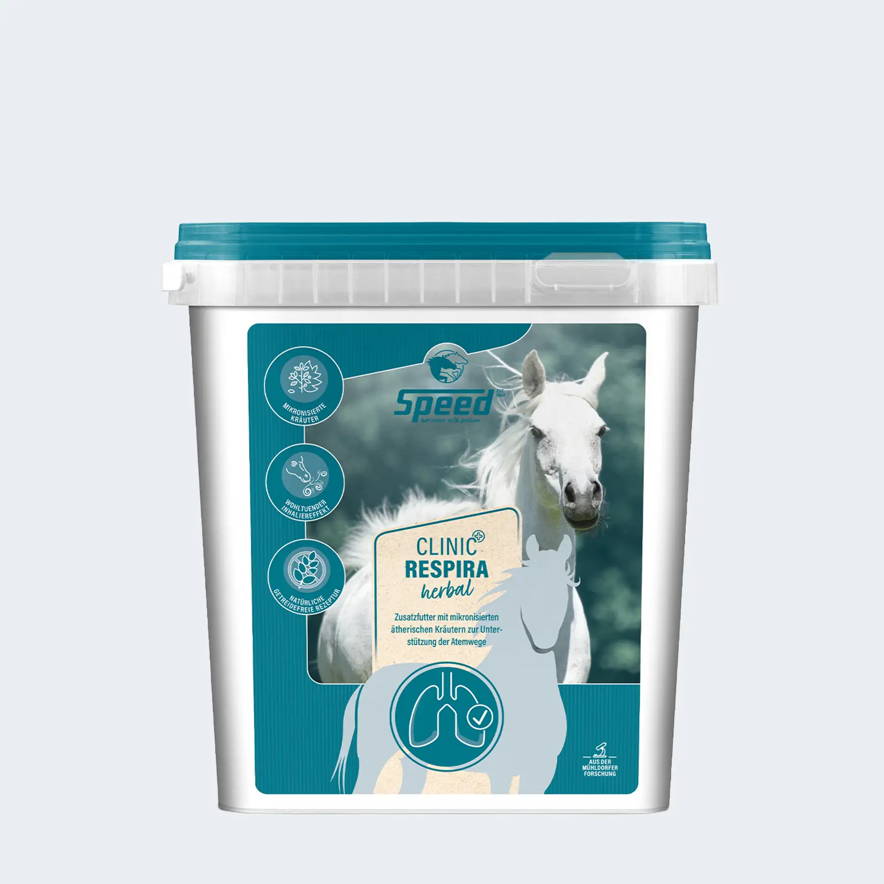 CLINIC RESPIRA von SPEED ist ein naturbelassenes, getreidefreies Zusatzfutter zur Unterstützung der Atemwege von Pferden.
